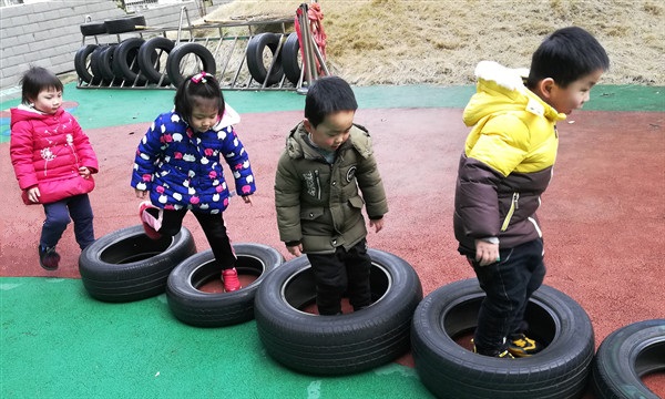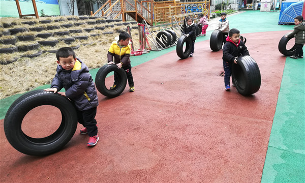 瞧,孩子们有的让轮胎滚动起来,有的把轮胎一个一个叠起来在躲进里面玩打地鼠的游戏,有的当成平衡木在上面行走,有的则是把轮胎竖起来从中间爬过去,还有的把轮胎堆成小山,大家一起攀爬“轮胎山”……,和轮胎来了一次最亲密的接触,孩子们把轮胎玩到了极致。