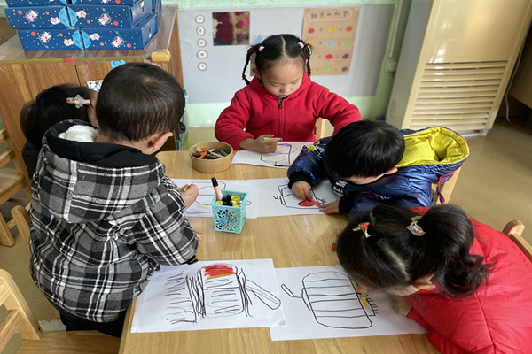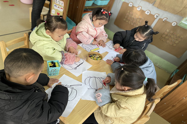 “新年到,新年到,敲锣打鼓真热闹……”区域活动在欢乐的音乐声中拉开序幕,小朋友们和老师一起边唱边跳,呈现出浓浓的迎新年气象。紧接着,大家一起做灯笼布置教室,小朋友们都很开心,拿起画笔做起红灯笼。瞧,虽然是小班的孩子们,但他们的动手能力一点都不差!热闹、喜庆的氛围充盈着整个教室。