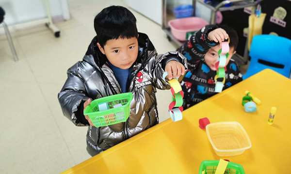 活动中,孩子们先拿起彩色的纸条一端,涂上胶水,再与另一端粘在一起,做成一个美丽的圆环!做好后,小脸上露出了得意的笑容,说:“老师你看,我的圆环做好啦!”然后在老师的指导下,再拿一张彩色的纸条穿过圆环,继续粘贴......虽然平时很调皮好动,但是今天孩子们却非常得认真,他们用手工表达着对妈妈浓浓的爱,深深的情......