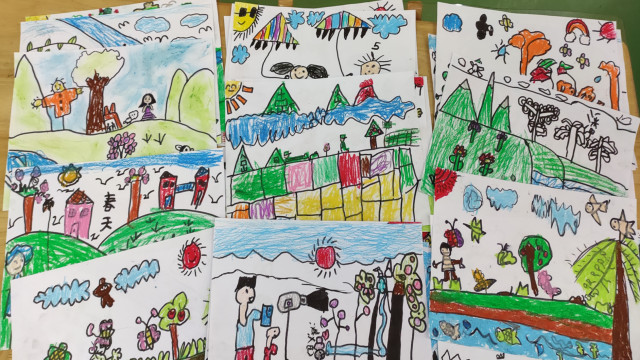 看,一幅幅绚丽的美景跃然纸上,有放风筝的小朋友,有全家春游野餐的美好画面……每一个孩子的心里都有一个不一样的灿烂春天,让人看着春意盎然!