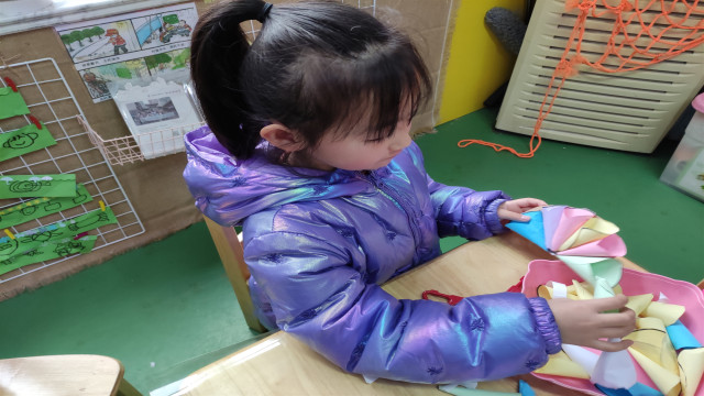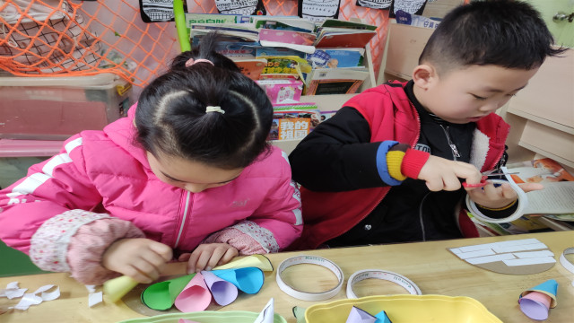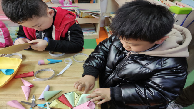 音乐活动后,有个小朋友突然提出:随风飘扬的柳枝好像一串串风铃。这种说法很快得到了许多孩子的赞同,经过一番讨论,孩子们决定自己动手做一个属于春天的风铃。孩子们自发分成几组,分工合作,有剪彩纸的,有卷纸筒的,有贴毛线的……,忙的不亦乐乎,最后小朋友们通过合作将制作好的东西组合粘贴起来,一个个漂亮的风铃就做好了!