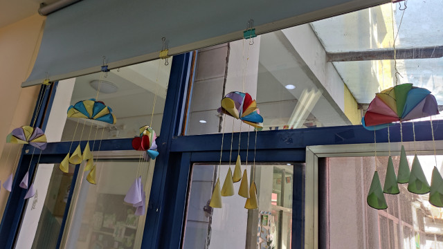 大家把做好的风铃挂在教室的窗户边,看,微风吹过,风铃随风摇曳,在向我们传递春的消息呢!