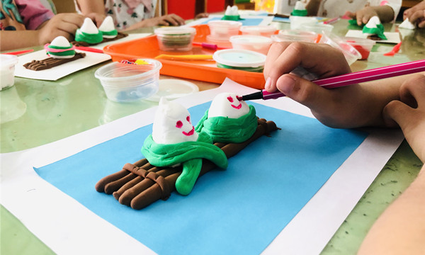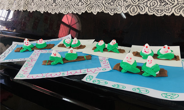 准备好包粽子的所需的黏土材料及工具,先将白色的黏土通过搓、捏呈三棱锥的形状,可以给粽子加一点料,如红色小圆做红豆,黄色圆球做咸蛋黄、咖啡色小方块做肉;再用绿色的黏土搓成长条压扁,用工具压出粽叶的纹理;将粽子包裹起来,装饰粽子的表情。一个个逼真的黏土粽子就完成啦!