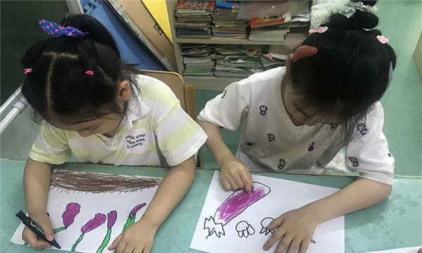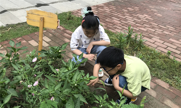 活动中,教师带领幼儿来到户外菜园,引导幼儿观察菜园里蔬菜的成长变化,并引导幼儿发现菜园中的小虫子。活动中,幼儿自主观察蔬菜到底怎么啦,叶子上为什么会长洞洞呢?通过仔细观察,很快幼儿就发现了原因,原来是长虫了,有的幼儿还大胆的给蔬菜捉青虫。活动结束前,幼儿回到室内,将自己观察到的事物用绘画的形式记录下来。