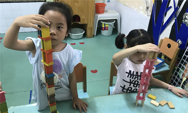 首先,请幼儿自己挑选十块多米诺骨牌;其次,给幼儿设定五分钟的游戏时间;最后,比比谁的多米诺骨牌垒的最高,并进行作品展示和分享交流。