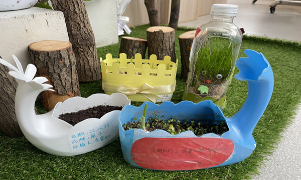 家长和幼儿、老师们一起收集的各种废旧材料,比如木头、树枝,麻绳、瓶子、石头等等,构建了独具特色的种养殖区。用过的洗衣液瓶子在家长和孩子的制作下种上植物显得分外有生机,各种绿植错落有致的摆放,生机盎然,孩子们最喜欢来照顾这些亲手栽培的花花草草。