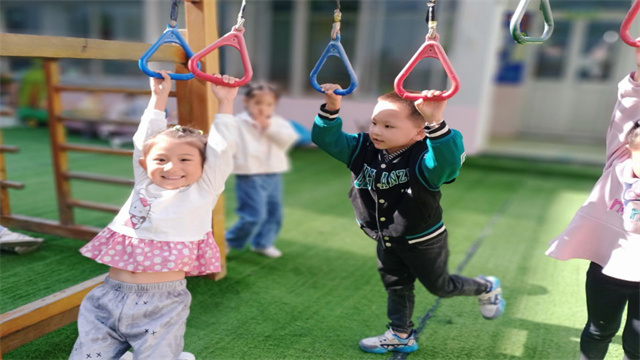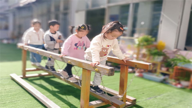 喜爱游戏、热爱运动是幼儿的天性。借助孩子感兴趣的运动,实施适宜的游戏指导,使幼儿园的户外体育活动更加丰富有趣,满足幼儿好动与探究的本性。平衡类器械看似简单,实则蕴含很多运动技巧。不仅可以锻炼幼儿的身体平衡能力及控制力,同时能够很好地促进手、眼、脚协调能力的发展。孩子们在缤纷多彩的户外世界里,在走、跑、跳、钻、爬的过程中,逐步做到快速、有力、灵活、协调,运动技能得到充分锻炼,帮助幼儿克服胆怯心理,增强自信心。
